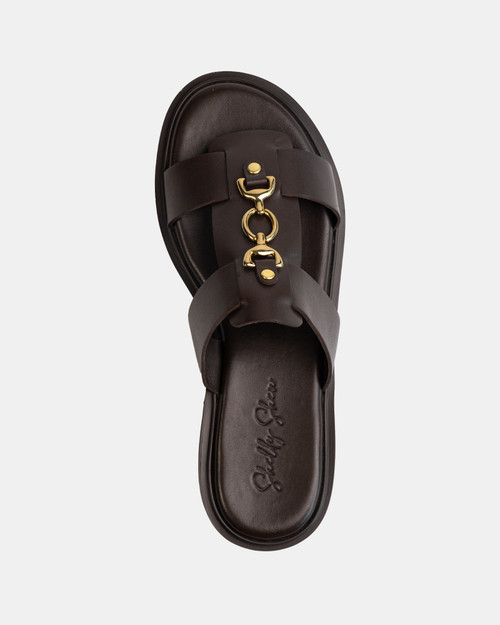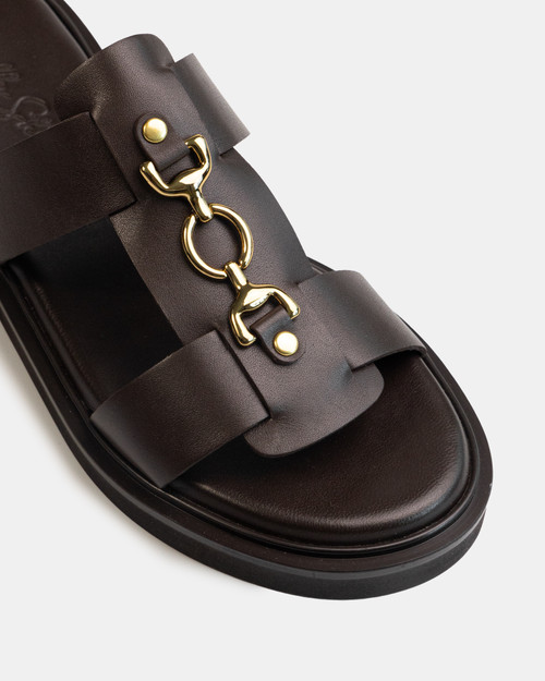 Chic with a touch of polish, the Nikola slide by Shelly Shen is crafted with a sleek leather upper, soft leather lining and sock, and a 3cm heel for subtle lift. A rounded toe and detailed trim complete this modern everyday essential.