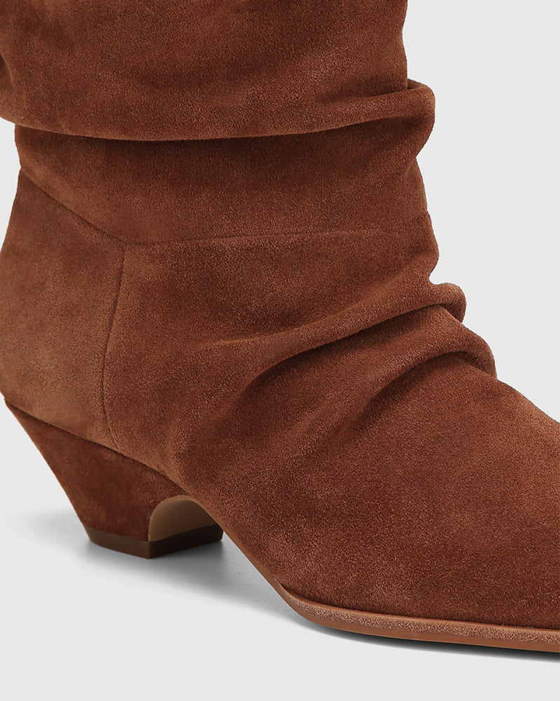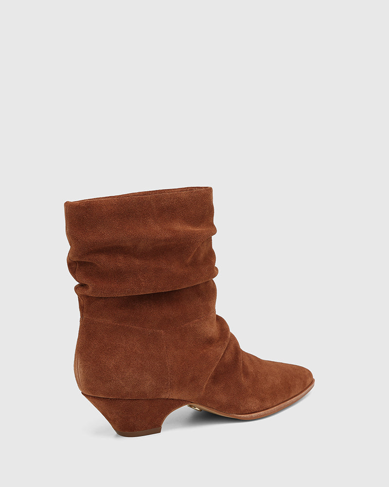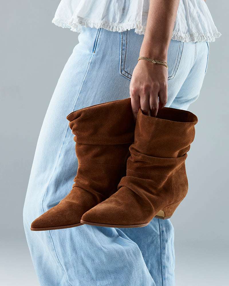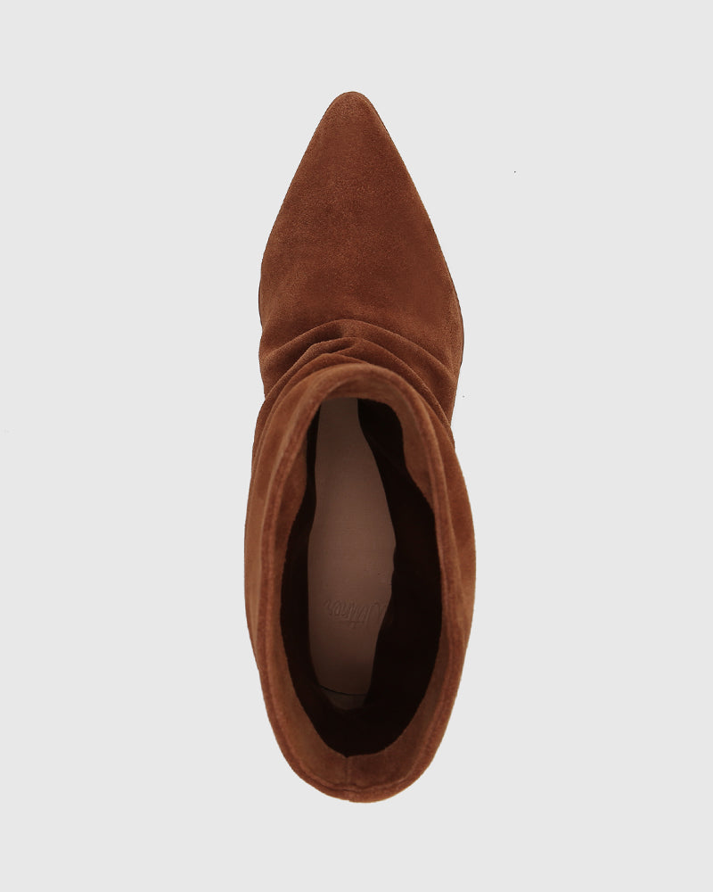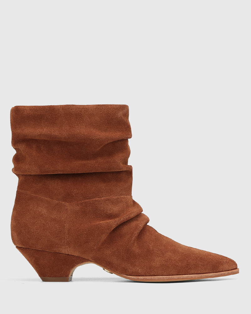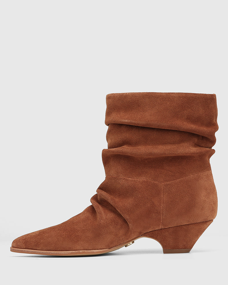 Meet your new go-to ankle boot, Axiel. Thoughtfully crafted in premium rich tan suede, they feature a sleek pointed toe, stacked cuban heel and a ruched pull-on silhouette for effortless throw-on-and-go style. Pairs perfectly with relaxed denim or flowy dress for an elevated everyday ensemble.