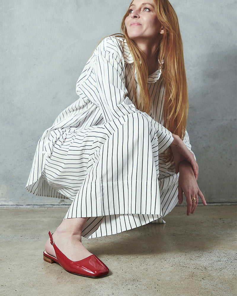 Did someone say trans-seasonal? When you're not sure what to wear, choose Bev. Crafted from luxe red patent leather, this design is perfect for those in between days. Inspired by a classic mary jane, this flat slingback style offers a chic aesthetic that goes with everything.