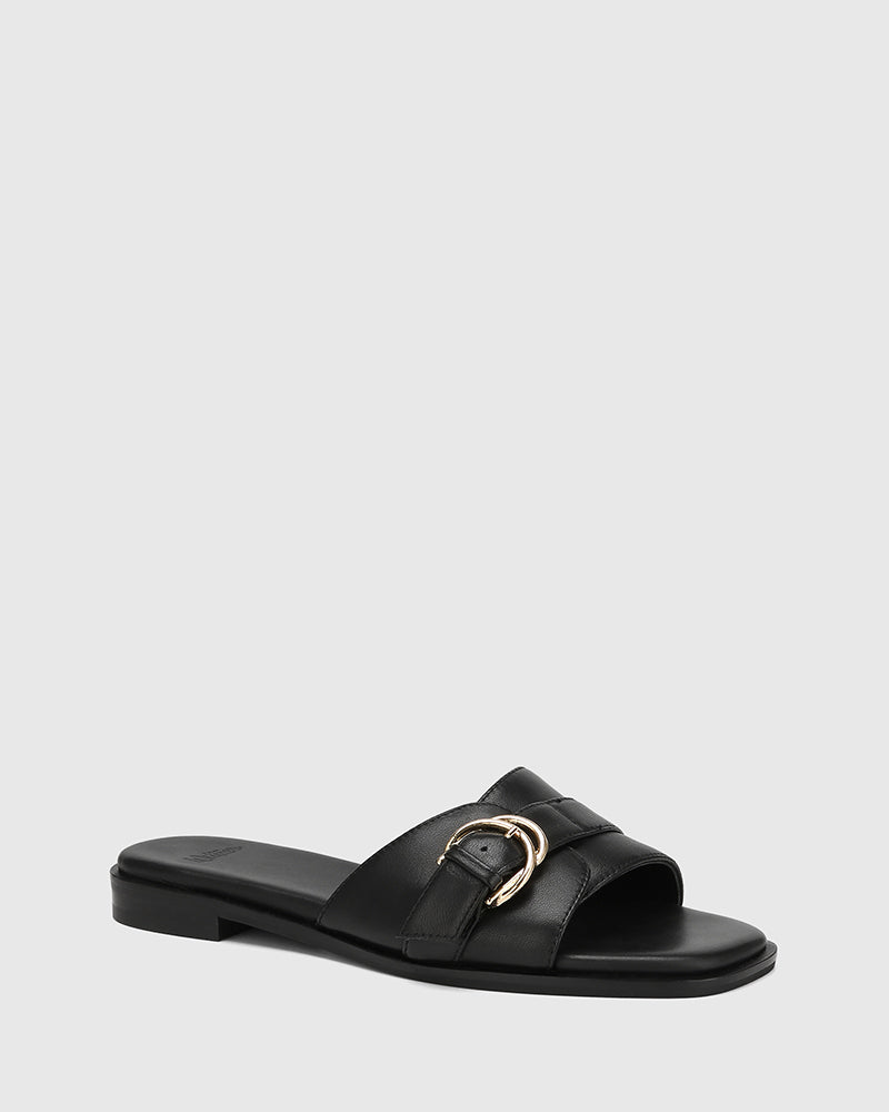 The Delmore in black is an elegant slip-on style, perfect for summer evenings. Featuring a gold adjustable hardware on the upper, this flat style will add a touch of femininity to any look. Try it with a loose fitting midi dress this season.
