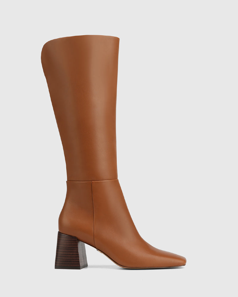 Featuring a square toe and polished leather stack heel, Nilo in black is a chic knee high boot crafted with premium nappa leather. This boot is designed to elongate the leg and elevate any look instantly. Pair it with a denim and an oversized blazer for a corporate-casual look sure to turn heads.