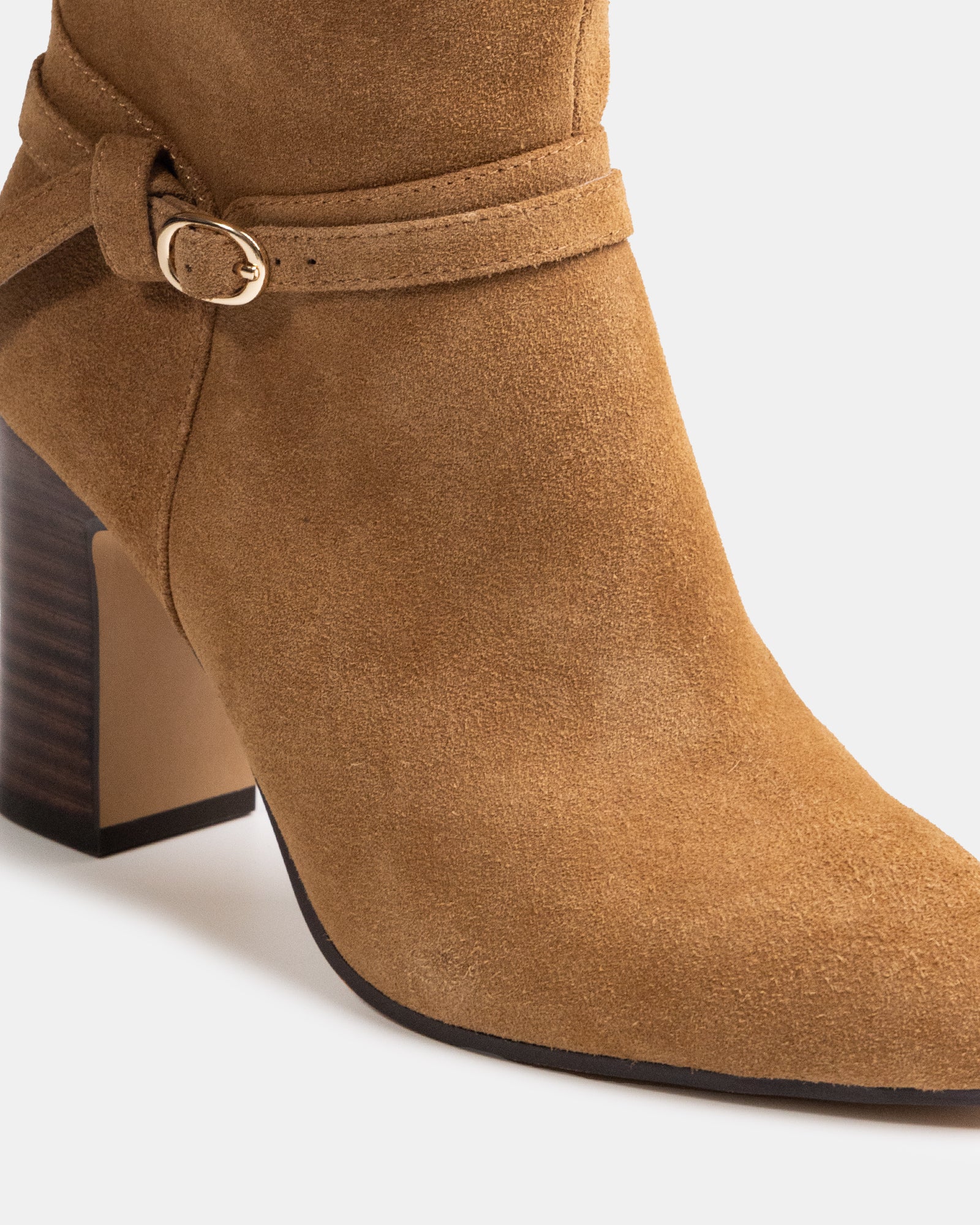 It's all in the details when it comes to the perfect knee-high boot. The Presley boot is crafted in impeccably soft leather and rendered in a nutmeg hue. This ultra-luxe long boot finds balance with its natural stacked block heel, fine gold embellishments and contrasting top-stitch design. Style your way with a pleated maxi skirt and a white cotton tee.
